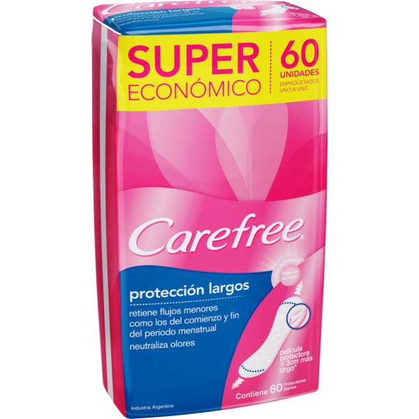 CAREFREE Protección Largo es 3 cm más largo que los protectores convencionales para brindarte más seguridad y frescura a lo largo del día. Además tiene una superficie delicadamente suave porque está hecho con lo mejor del algodón. Logra neutralizar la humedad del área intima en 3 segundos y posee neutralizador de olores para que te sientas más segura todo el día, todos los días.