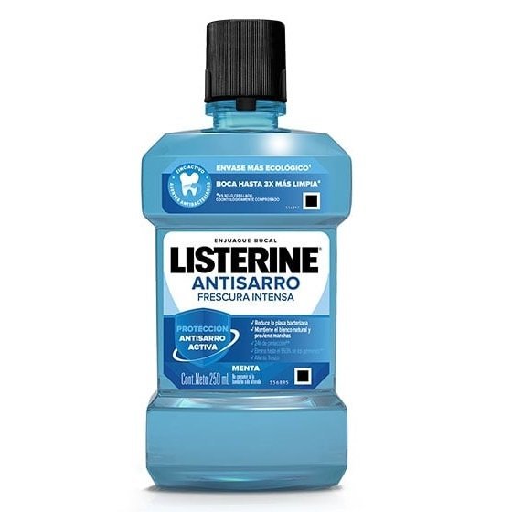 El enjuague bucal LISTERINE Anti Sarro previene y controla la formación de sarro dental. Además, ayuda a combatir los gérmenes que causan el mal aliento y la placa bacteriana, protegiendo las encías.