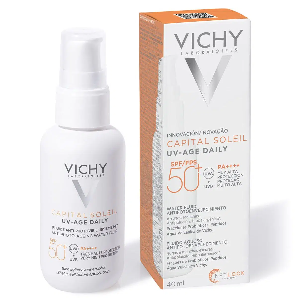 Capital Soleil UV Age es un protector solar diario de rostro que provee una muy alta protección UVA y UVB con un FPS 50+ y PPD 46, mientras corrige los signos del envejecimiento. Está formulado con activos dermatológicos antiedad, como péptidos y niacinamida, y con una tecnología Netlock, que crea una película protectora que protege la piel de los rayos UVA y UVB, la polución y la luz infrarroja. Textura fluida ultraligera. Testeado oftalmológica y dermatológicamente. Apto para pieles sensibles.